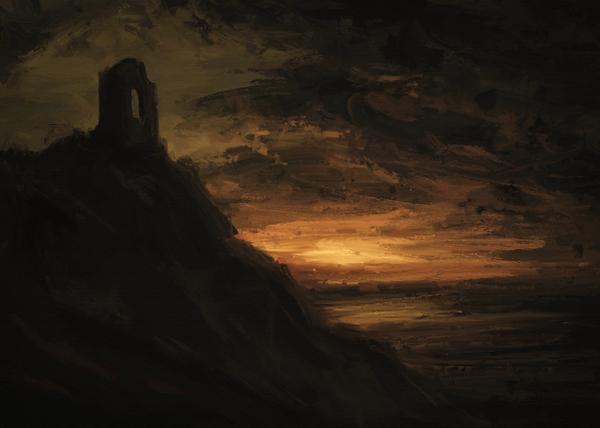 This untitled study belongs to a continuing investigation into the expressive capacity of light within absence, a theme that threads throughout my landscape practice. Here, the composition is reduced almost to abstraction: a solitary ruin perched on a precipice, its form nearly devoured by shadow, while a thin seam of gold dissolves along the horizon.