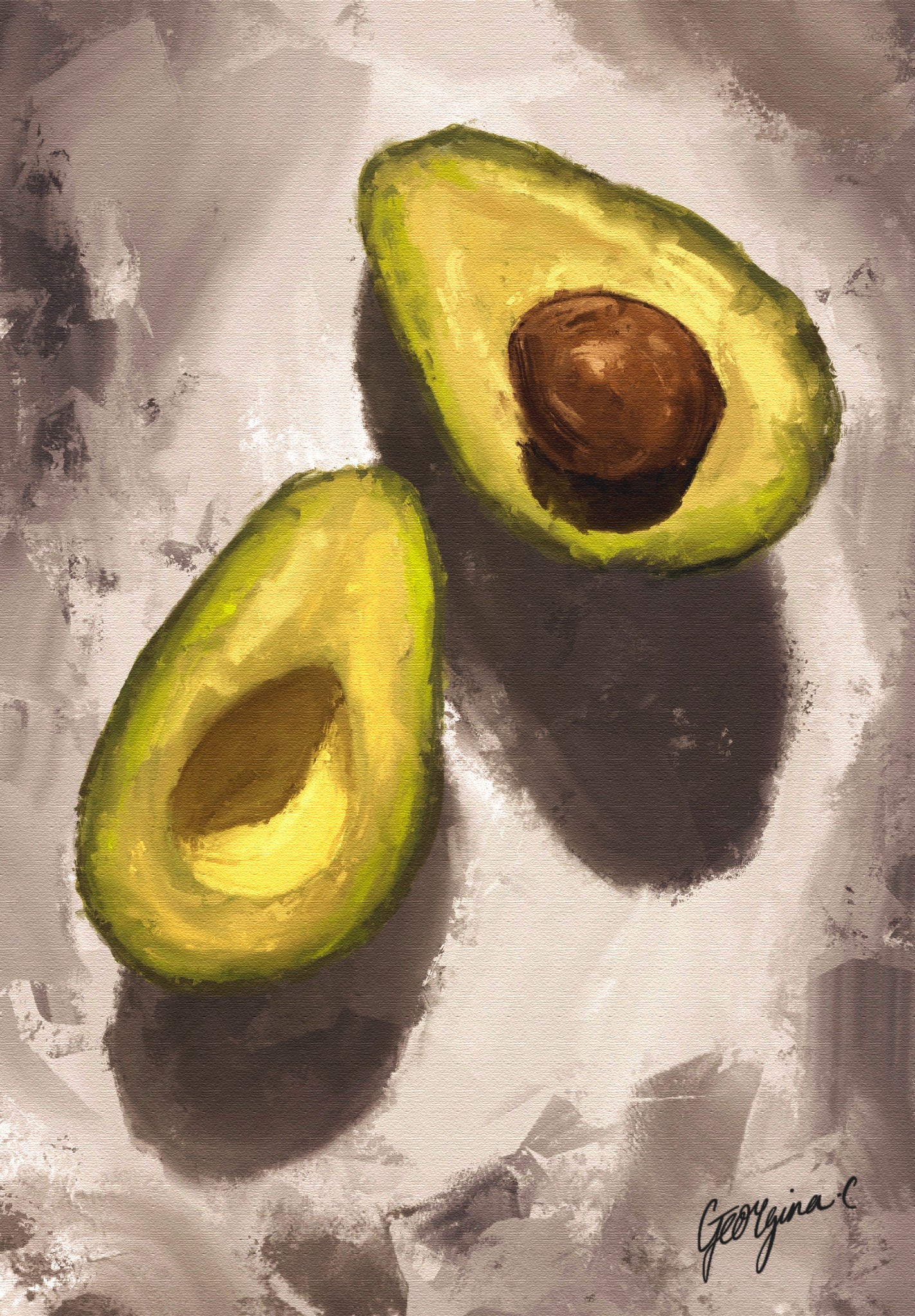 Painted digitally using broad oil-style strokes, this study employs a restrained palette of yellow-green, ochre, and neutral grey tones. The background was applied with loose, gestural brushwork to mimic the spontaneity of a traditional underpainting. Attention was given to the subtle interplay between matte and gloss surfaces, achieved through selective glazing on the pit and edges. The composition’s simplicity is intentional, allowing the focus to remain on the tactile realism of the subject.
