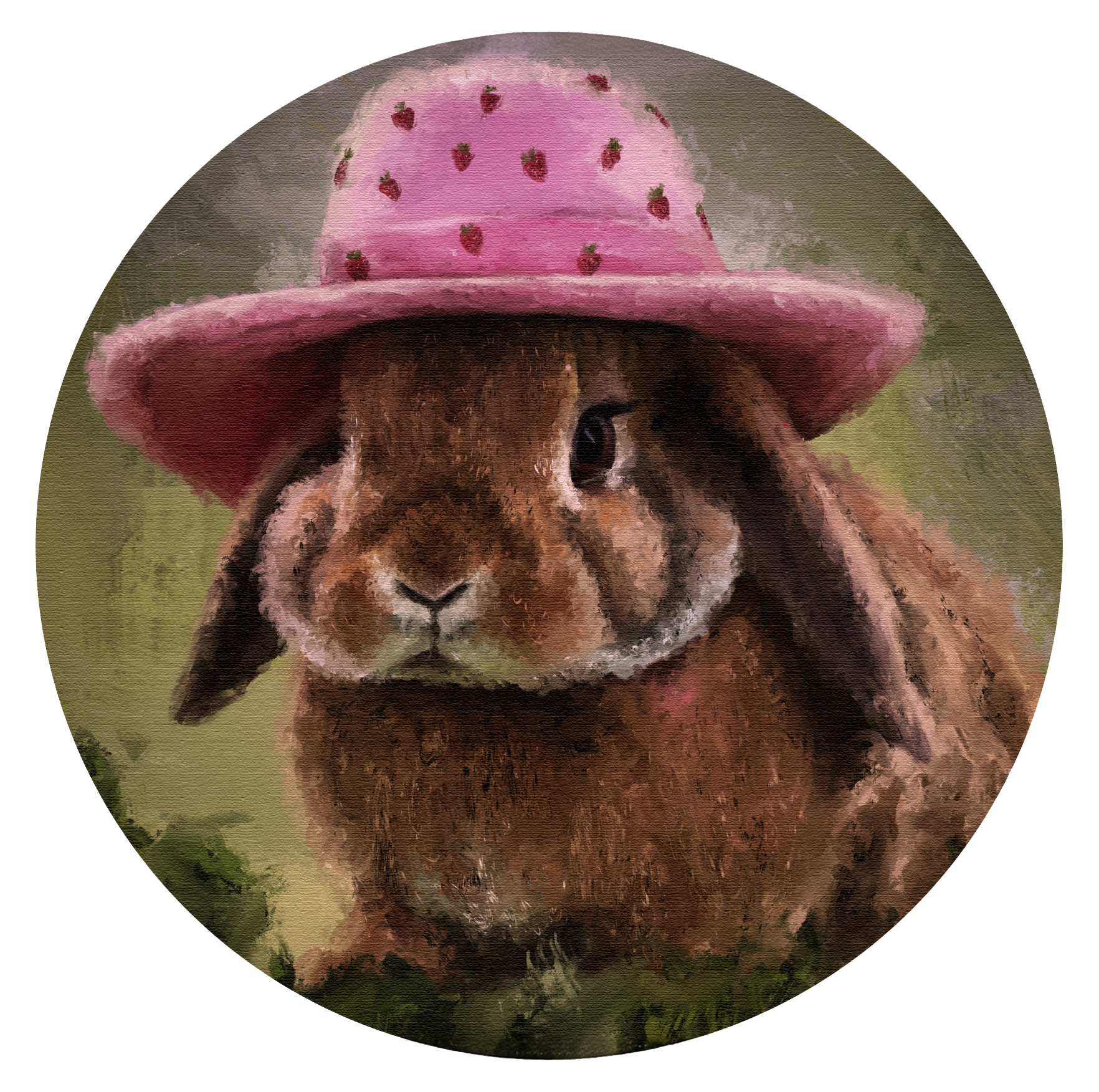 Painted digitally using a textured impasto brush set to emulate traditional oils, Berry Bunny uses short, feathered strokes to define the fur and softer glazing to model the light on the hat. The colour palette blends warm sienna tones with rose and muted green to evoke an early-spring atmosphere. The circular crop was chosen to echo traditional miniature portraiture, turning a playful subject into a refined, tactile design suitable for small-format reproduction, such as stickers or charms.