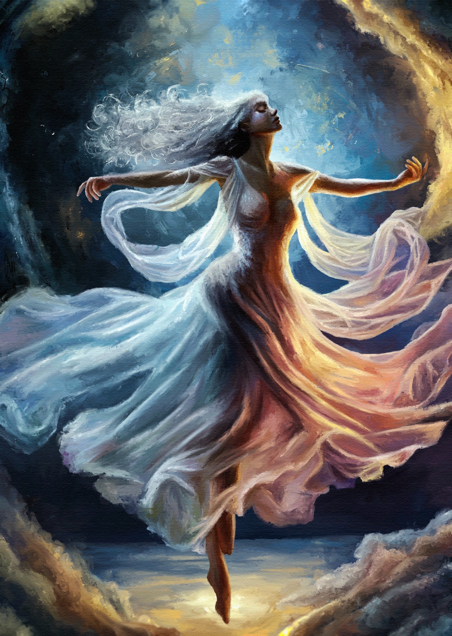 The figure’s pose expresses surrender rather than victory. Her arms extend outward, her body lifted by unseen currents, suspended between exhaustion and peace. I wanted her to feel both celestial and human—an embodiment of light that knows it must fade to be reborn.