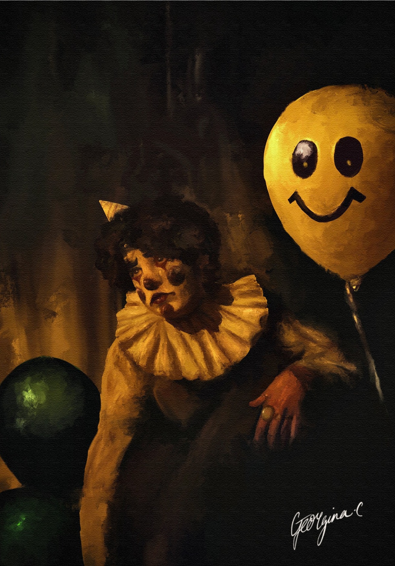 The figure slumps in a pool of amber light, their makeup smeared, their costume wilted. Beside them floats a yellow balloon stamped with a perfect smile — a caricature of happiness that feels almost menacing in its cheerfulness. That juxtaposition became the emotional centre of the painting: the quiet tension between authenticity and performance, exhaustion and expectation.
