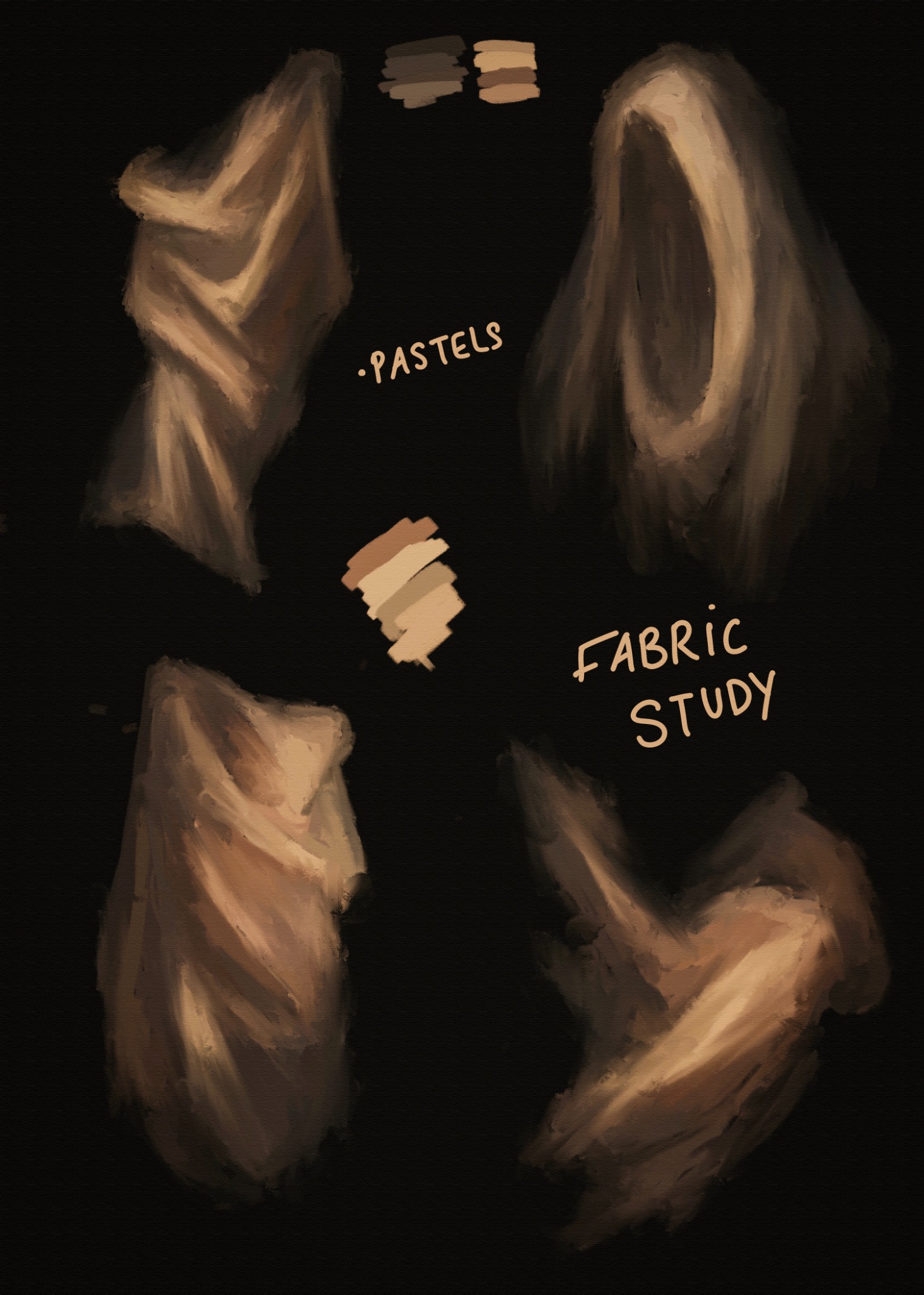 Painted digitally with a focus on pastel tonal ranges and warm neutral hues, this study used direct brushwork with minimal blending. The dark background heightens the luminosity of the cloth, allowing chiaroscuro to define structure. Palette samples were recorded within the composition to preserve the specific range of muted rose, cream, and sienna tones for future reference.