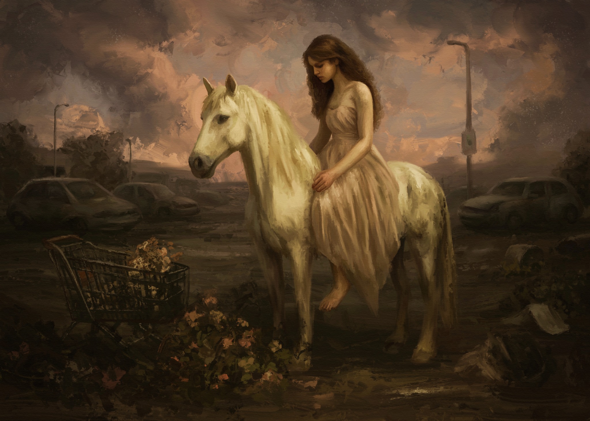 In Soft Apocalypse, the end of the world arrives quietly, not with fire or ruin, but with melancholy stillness. A barefoot woman in a faded pink dress sits sidesaddle on a white horse amid an abandoned car park. The evening sky burns faintly gold against bruised clouds, and a broken shopping trolley filled with wilted flowers leans beside her. Everything around her feels touched by both decay and grace.