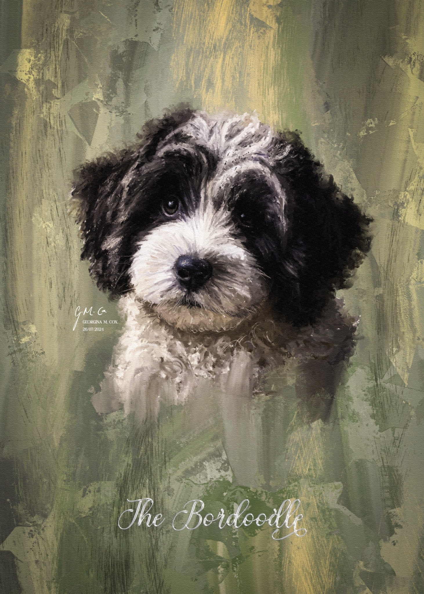 Painted digitally in layered oil technique, The Bordoodle combines soft underpainting with higher-opacity strokes to replicate the feel of natural hair and depth. The palette is built around neutral greens and creams, with delicate violet-grey tones in the shadows to introduce tonal variation. Brushwork was intentionally varied — from broad sweeps in the background to fine impasto around the muzzle — to maintain energy and texture throughout the composition. The piece is both a technical exercise and a gentle celebration of form and light.