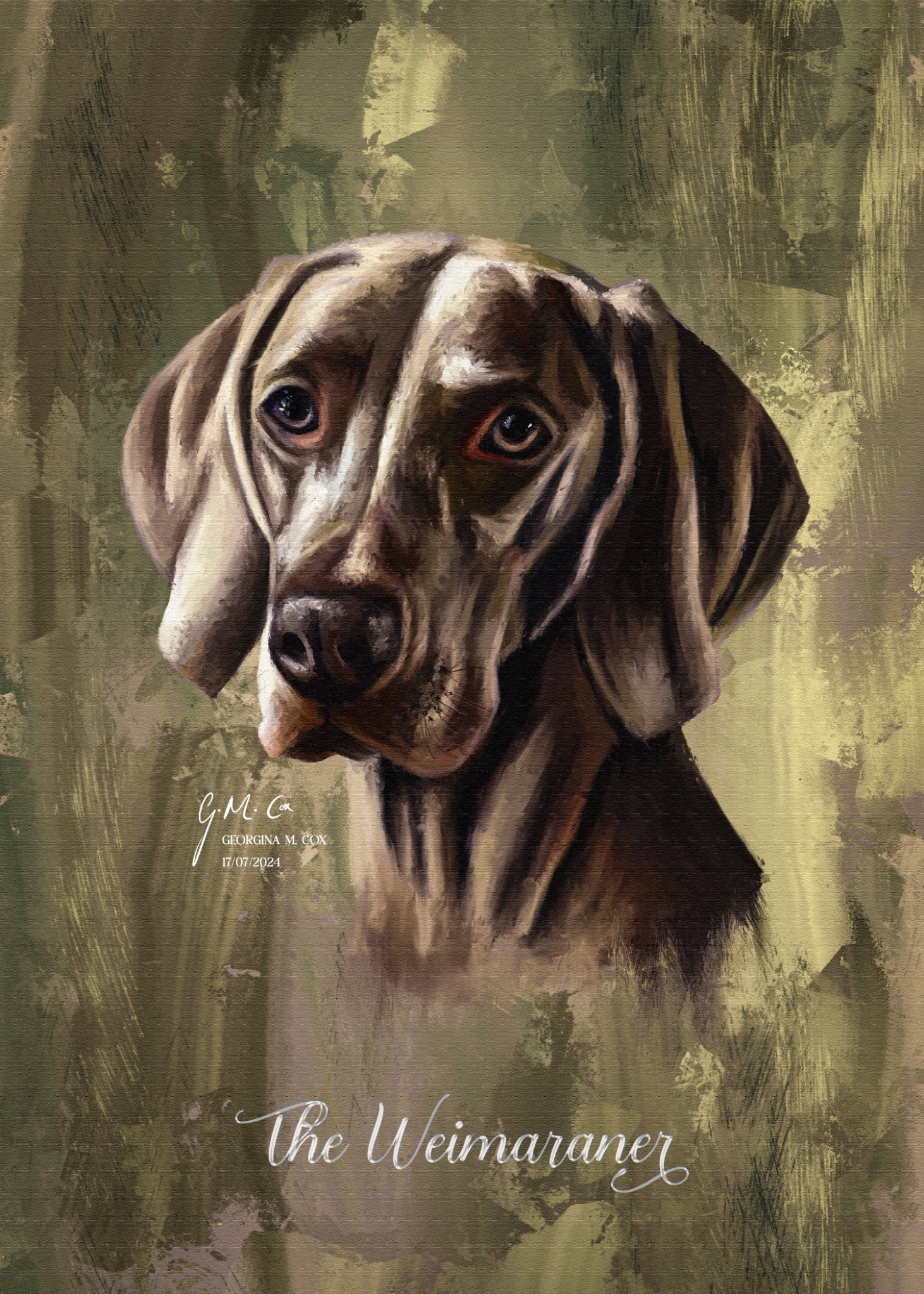 The Weimaraner was painted as an independent study exploring the balance between realism and painterly abstraction. The breed’s naturally sculptural form lends itself to study — the soft fall of the ears, the reflective surface of the coat, and the dignified tension of its posture. This painting seeks to capture that distinctive elegance while retaining the spontaneity of brushwork that defines my animal portraits.