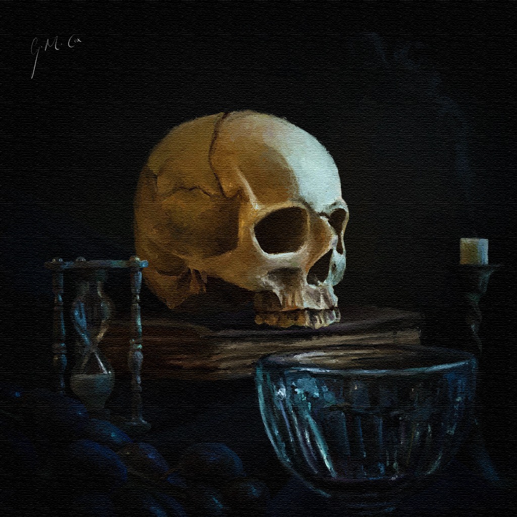 Painted digitally using layered chiaroscuro techniques, Vaditas emulates the texture and tonality of classical oil painting. The palette was restricted to earth tones, umber, and muted blues, with subtle glazes to evoke the weight of aged varnish. Each object was rendered with attention to surface — from the porous matte of bone to the refractive density of glass — to create a dialogue between opacity and transparency. Compositionally, the painting adheres to the triangular balance of traditional vanitas works, anchoring darkness with a single light source to invite meditative focus.