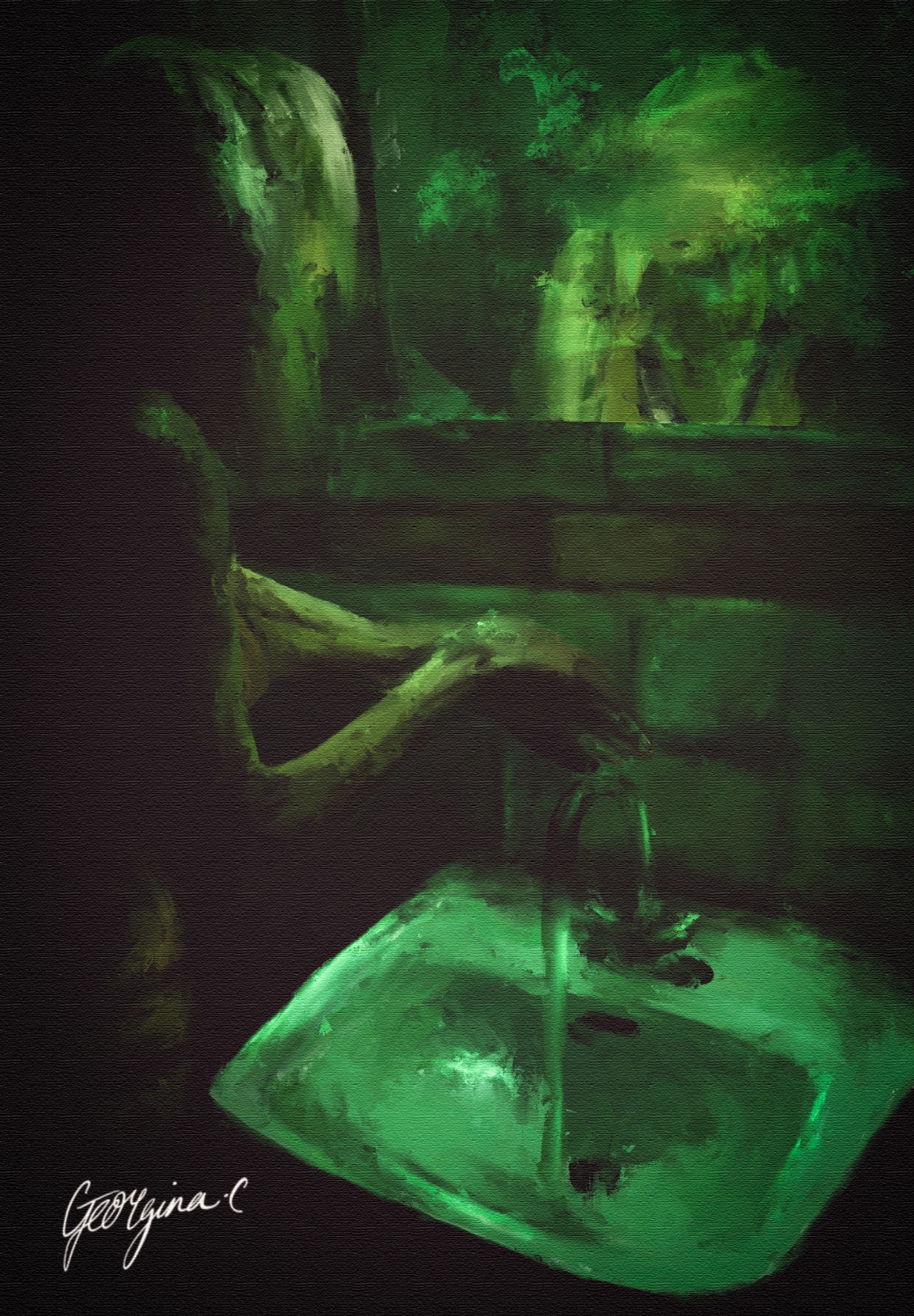 Verdant (2023) explores reflection, contamination, and rebirth through a palette of corrosive green light. Blending Baroque chiaroscuro with psychological horror, Georgina M. Cox examines the tension between self-cleansing and self-erasure — what it means to wash your hands of something that’s already inside you.