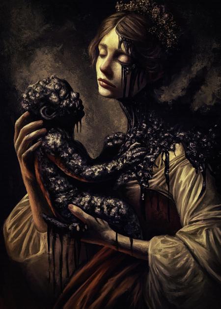 A veiled figure cradles a darkened sun, its face both divine and wounded. Her expression is not regretful, but reverent — a grief that refuses to let go. This work explores themes of loss, spiritual disillusionment, and the eroticism of destruction.