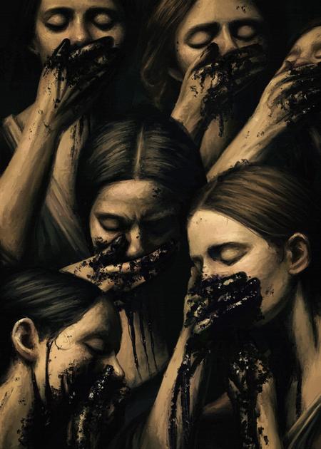 We Must Not Speak of It is a digital painting exploring enforced silence, collective complicity, and the weight of what’s unspoken. Multiple women mirror each other — hands over mouths, black sludge seeping between their fingers, their eyes full of knowing.