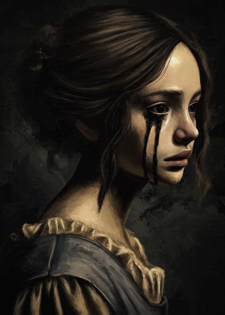 Her gaze doesn’t seek pity. It indicts. The tears streak like brushstrokes, caught somewhere between realism and ruin.