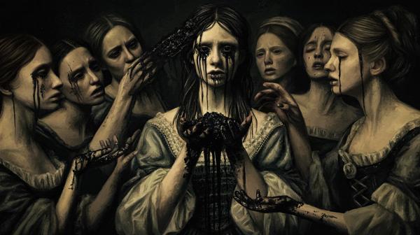 The central figure is surrounded by dozens of near-identical women, each passive, each haunting. There’s no violence, no overt threat — only the horror of obedience, of being watched, of being part of something you cannot leave.