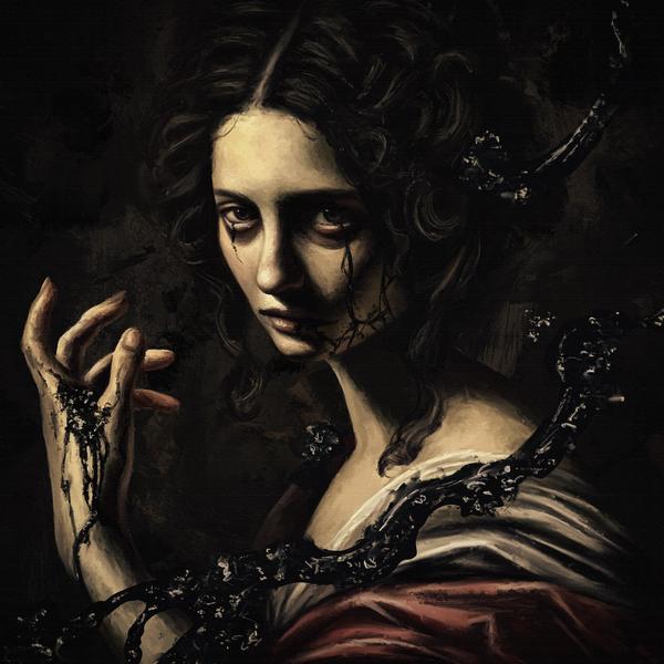 Part of the Damnation series, the piece mimics oil through digital texture and chiaroscuro light, holding the viewer in an intimate, accusatory gaze.