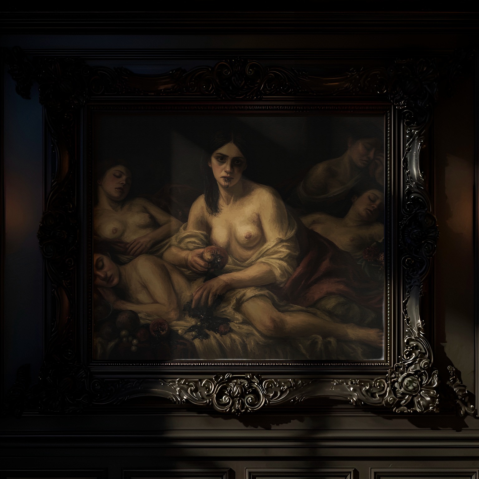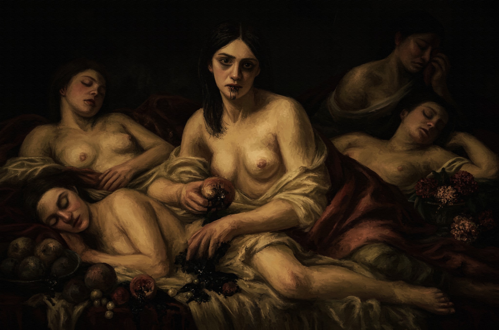 The central figure, pomegranate in hand, gazes directly outward; lips darkened by the fruit of her undoing. Around her, others rest in silence: witnesses, saints, or remnants.